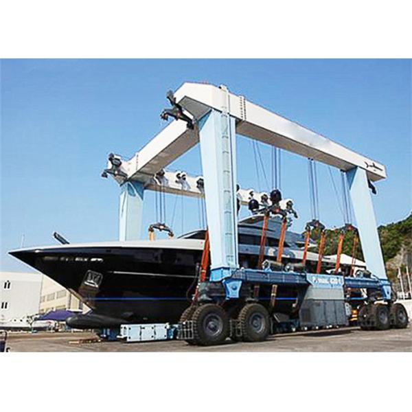 The Boat Hoist Crane includes the following items: main structure, traveling wheel block, hoisting mechanism, steering mechanism, hydraulic transmission system, electric control system, the main structure for the type , it can transfer the boat which the height surpass its height. According to different requirements of our customers, the Boat Hoist Crane can handling different tons boat or yacht (10T-1200T) from the shore side, it can be used for the maintenance on the shore side or can put the new boat inside the water. It adopts the soft and firm belt to lift the boat, yacht; it will never hurt the surface. It also can put the boat in sequence quickly with small gap between each two boat.